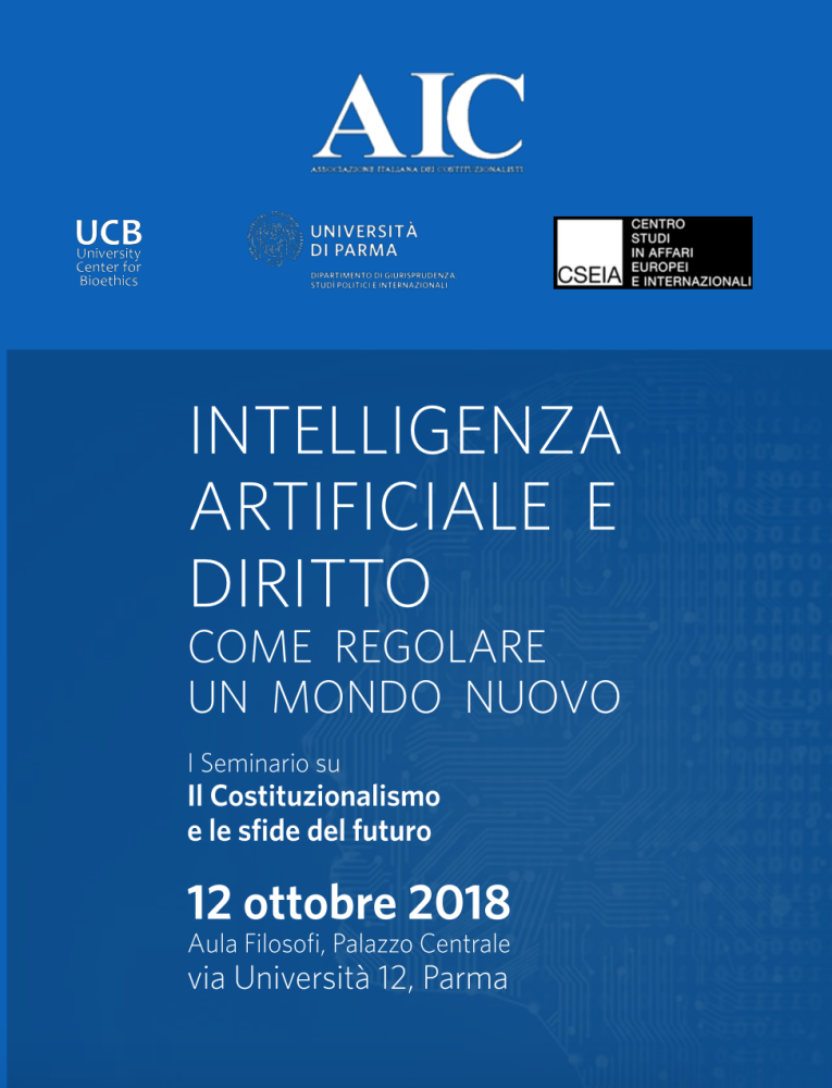 Il giorno 12 ottobre 2018, presso l'Università degli Studi di Parma, ha avuto luogo il convegno "Intelligenza artificiale e diritto: come regolare un mondo nuovo", organizzato dall'Associazione Italiana dei Costituzionalisti, in collaborazione con il Dipartimento di Giurisprudenza, Studi Politici e Internazionali, il Centro di Bioetica e CSEIA.