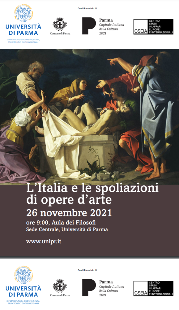 Venerdì 26 novembre 2021, nel quadro delle celebrazioni di Parma Capitale della Cultura 2020+2021, il Centro Studi in Affari Europei e Internazionali-CSEIA, in collaborazione con il Dipartimento di Giurisprudenza, Studî politici e internazionali dell’Università di Parma, ha organizzato un convegno, intitolato "L’Italia e le spoliazioni di opere d’arte", che si terrrà alle ore 9, nell’Aula dei Filosofi. In tale contesto, l'attenzione si concentrerà sulla questione della restituzione delle opere d'arte trafugate, ma con un approccio interdisciplinare e ponendo particolare attenzione nei confronti delle spoliazioni napoleoniche e del loro impatto a Parma e sull’avventuroso salvataggio della Regia Galleria di Parma durante la Seconda guerra mondiale.