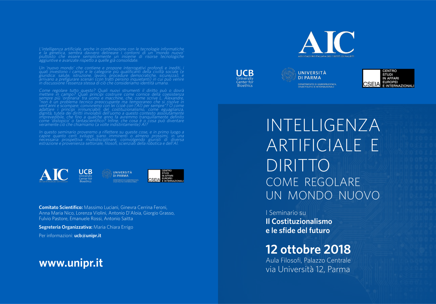 Il giorno 12 ottobre 2018, presso l'Università degli Studi di Parma, ha avuto luogo il convegno "Intelligenza artificiale e diritto: come regolare un mondo nuovo", organizzato dall'Associazione Italiana dei Costituzionalisti, in collaborazione con il Dipartimento di Giurisprudenza, Studi Politici e Internazionali, il Centro di Bioetica e CSEIA.