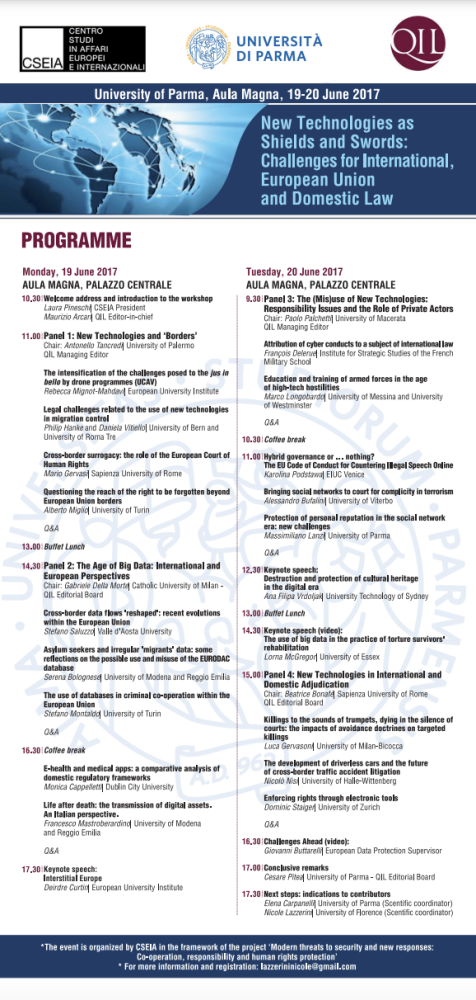 Il 19 e 20 giugno 2017, si è tenuto presso il Palazzo Centrale dell'Università di Parma un workshop, aperto alla partecipazione di giovani ricercatori italiani e stranieri, sul tema "New Technologies as Shields and Swords: Challenges for International, European Union and Domestic Law", co-organizzato dal Centro Studi CSEIA e dalla rivista elettronica QIL (Questions of International Law).