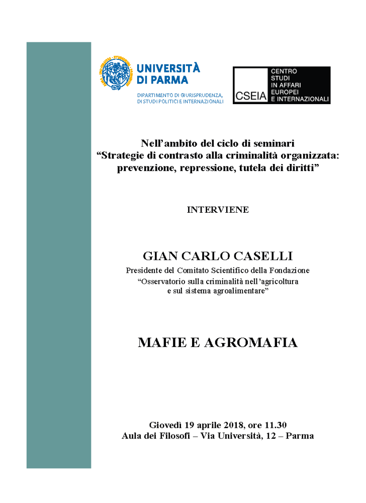 Nei giorni 19 aprile e 2 maggio 2018, si è tenuto il ciclo di incontri "Strategie di contrasto alla criminalità organizzata: prevenzione, repressione e tutela dei diritti", organizzato congiuntamente dal Dipartimento di Giurisprudenza, Studi Politici e Internazionali dell'Università di Parma e da CSEIA. Nell'ambito di questa iniziativa, il 19 aprile 2018, alle ore 11.30, presso l'Aula dei Filosofi del Palazzo centrale di Ateneo, il Dott. Gian Carlo Caselli, Presidente del Comitato Scientifico della Fondazione "Osservatorio sulla criminalità nell'agricoltura e sul sistema agroalimentare", ha tenuto una relazione dal titolo "Mafie e agromafia".