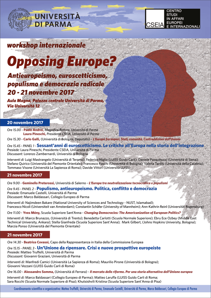 Nei giorni 20-21 novembre 2017, presso l'Aula Magna del Palazzo centrale dell'Università di Parma, si è svolto il workshop internazionale "Opposing Europe? Antieuropeismo, euroscetticismo, populismo e democrazia radicale".