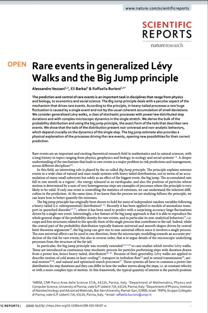 A. Vezzani, E. Barkai, R. Burioni, Rare Events in Generalized Levy Walks and the Big Jump Principle, in Nature Scientific Reports, 2020