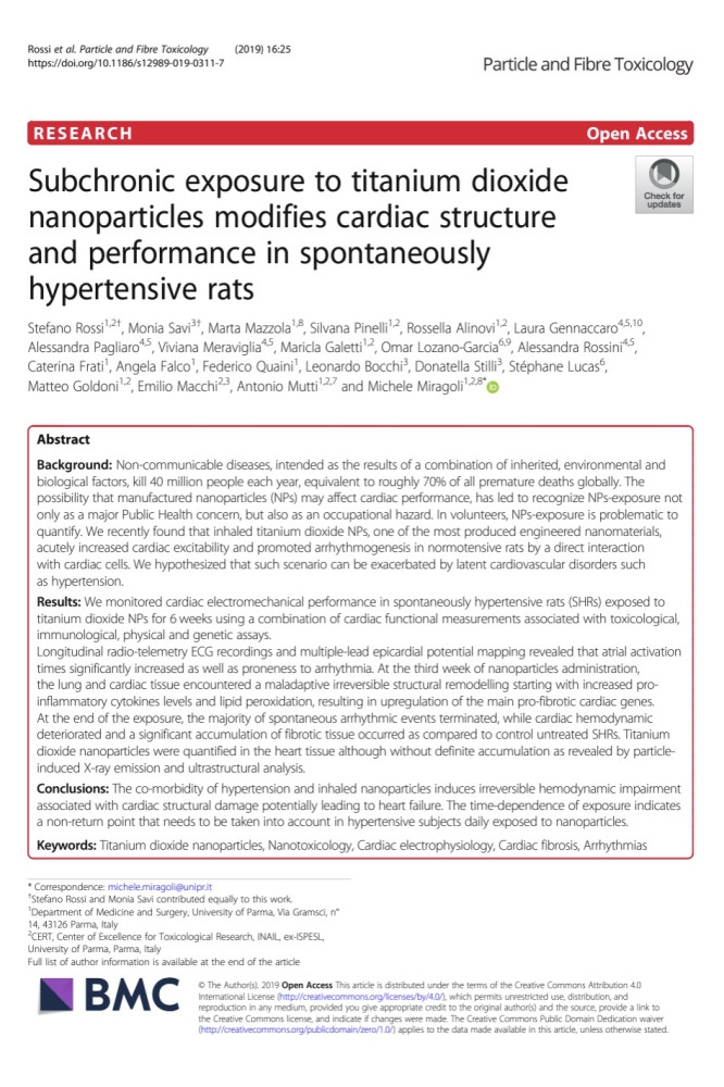S. Rossi, M. Savi, M. Mazzola et al, Subchronic exposure to titanium dioxide nanoparticles modifies cardiac structure and performance in spontaneously hypertensive rats, in Particle and Fibre Toxicology, 2019