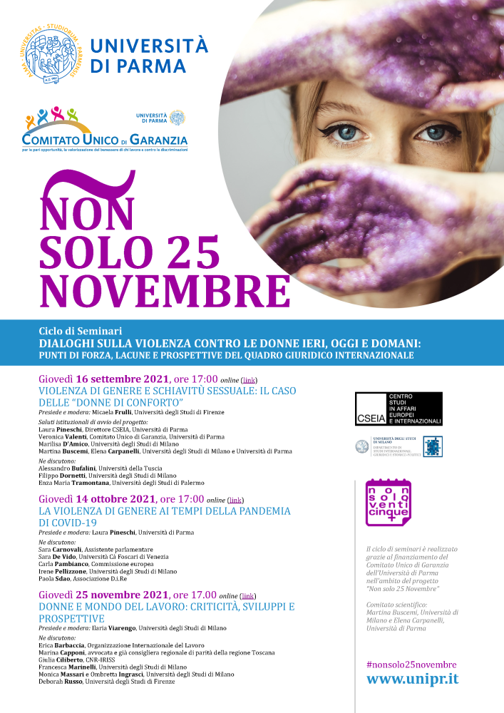 Si intitola “Dialoghi sulla violenza contro le donne ieri, oggi e domani: punti di forza, lacune e prospettive del quadro giuridico internazionale” il ciclo di tre seminari on line organizzati dal Centro Studi in Affari Europei e Internazionali (CSEIA) dell’Università di Parma in collaborazione con l’Università degli Studi di Milano e realizzato grazie al finanziamento del Comitato Unico di Garanzia per le pari opportunità, la valorizzazione del benessere di chi lavora e contro le discriminazioni (CUG) dell’Ateneo nell’ambito del progetto “Non solo 25 Novembre”. Il primo appuntamento (Violenza di genere e schiavitù sessuale: il caso delle “donne di conforto”) è in programma per giovedì 16 settembre: dopo i saluti di Laura Pineschi, Direttrice CSEIA, Veronica Valenti (CUG), Marilisa D’Amico (Università degli Studi di Milano), Martina Buscemi ed Elena Carpanelli (rispettivamente dell’Università degli Studi di Milano e dell’Università di Parma), interverranno Alessandro Bufalini (Università degli Studi della Tuscia), Filippo Dornetti (Università degli Studi di Milano) ed Enza Maria Tramontana (Università degli Studi di Palermo). A moderare l’incontro sarà Micaela Frulli dell’Università degli Studi di Firenze. La violenza di genere ai tempi della pandemia di COVID-19 sarà invece il tema del secondo seminario fissato per giovedì 14 ottobre. Ne discuteranno Sara Carnovali, Assistente parlamentare, Sara De Vido (Università Ca’ Foscari di Venezia), Carla Pambianco (Commissione europea), Irene Pellizzone (Università degli Studi di Milano), Paola Sdao (Associazione D.i.Re). Modererà Laura Pineschi (Università di Parma). Giovedì 25 novembre terzo e ultimo appuntamento per parlare di Donne e mondo del lavoro: criticità, sviluppi e prospettive. Interverranno Erica Barbaccia (Organizzazione Internazionale del Lavoro), Marina Capponi, avvocata e già consigliera regionale di parità della Regione Toscana, Giulia Ciliberto (CNR-IRISS), Francesca Marinelli (Università degli Studi di Milano), Monica Massari e Ombretta Ingrascì (Università degli Studi di Milano), Deborah Russo (Università degli Studi di Firenze). A moderare sarà Ilaria Viarengo dell’Università degli Studi di Milano.