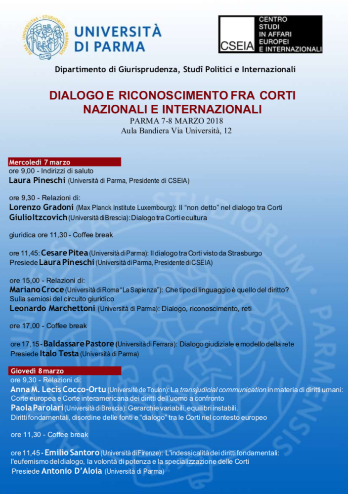 Nei giorni 7-8 marzo 2018, presso l'Aula Bandiera del Palazzo centrale dell'Università di Parma, si è tenuto il workshop "Dialogo e riconoscimento tra corti nazionali e internazionali", organizzato dal Dipartimento di Giurisprudenza, Studi Politici e Internazionali e patrocinato da CSEIA.