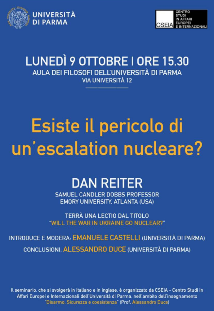 Il 9 ottobre si è tenuta la lecture del Prof. Dan Reiter, Samuel Candler Dobbs Professor alla Emory University, dal titolo “Will the War in Ukraine Go Nuclear?”, destinata agli studenti e alle studentesse dell’Università di Parma. L’evento, organizzato da CSEIA e svoltosi nell’ambito del corso “Disarmo, sicurezza e coesistenza”, è stato introdotto e moderato dal Prof. Emanuele Castelli; le conclusioni sono state tenute dal Prof. Alessandro Duce.