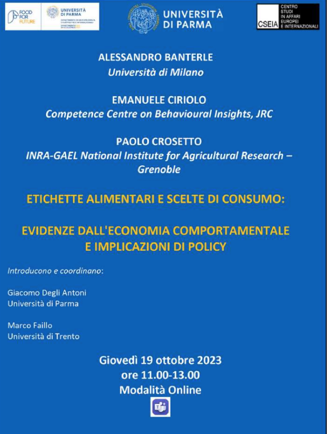 Il 19 ottobre si è svolto il webinar dal titolo “Etichette alimentari e scelte di consumo: evidenze dall'economia comportamentale e implicazioni di policy”, con relazioni di: Alessandro Banterle (Università di Milano); Emanuele Ciriolo (Competence Centre on Behavioural Insights,JRC - Joint Research Centre); e Paolo Crosetto (INRA-GAEL National Institute for Agricultural Research – Grenoble, France). L’incontro, patrocinato da CSEIA e coordinato dal Prof. Giacomo Degli Antoni, Docente di Economia politica (Università di Parma), rientra nelle attività del progetto di ricerca finanziato dall'Ateneo “A Sustainable Consumer Behaviour as a Driver for a More Sustainable Food Production: Economic and Legal Aspects”.