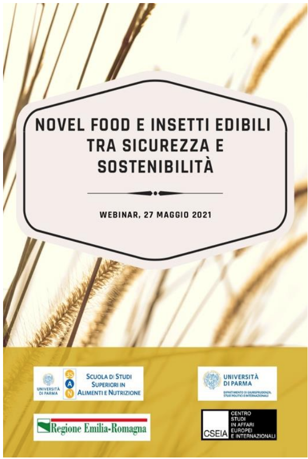 Il 27 maggio 2021, si è tenuto, tramite piattaforma Teams, un webinar sul tema "Novel Food e insetti edibili tra sicurezza alimentare e sostenibilità", L’appuntamento, organizzato dal Dipartimento di Giurisprudenza, Studî Politici e Internazionali dell'Università di Parma con la collaborazione del Centro Studi in Affari Europei e Internazionali (CSEIA) e della Scuola di Studi Superiori in Alimenti e Nutrizione e patrocinato dalla Regione Emilia-Romagna.